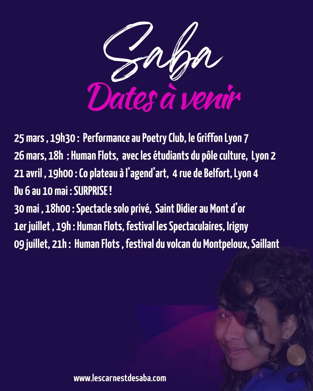 Deux spectacles tournent en ce moment, le spectacle Human flot avec les danseurs de la compagnie Stylistik qui aborde le thème des migrations, et les carnets de Saba, mon spectacle solo, dans lequel lequel le carnets de voyage prend vie en poésie.